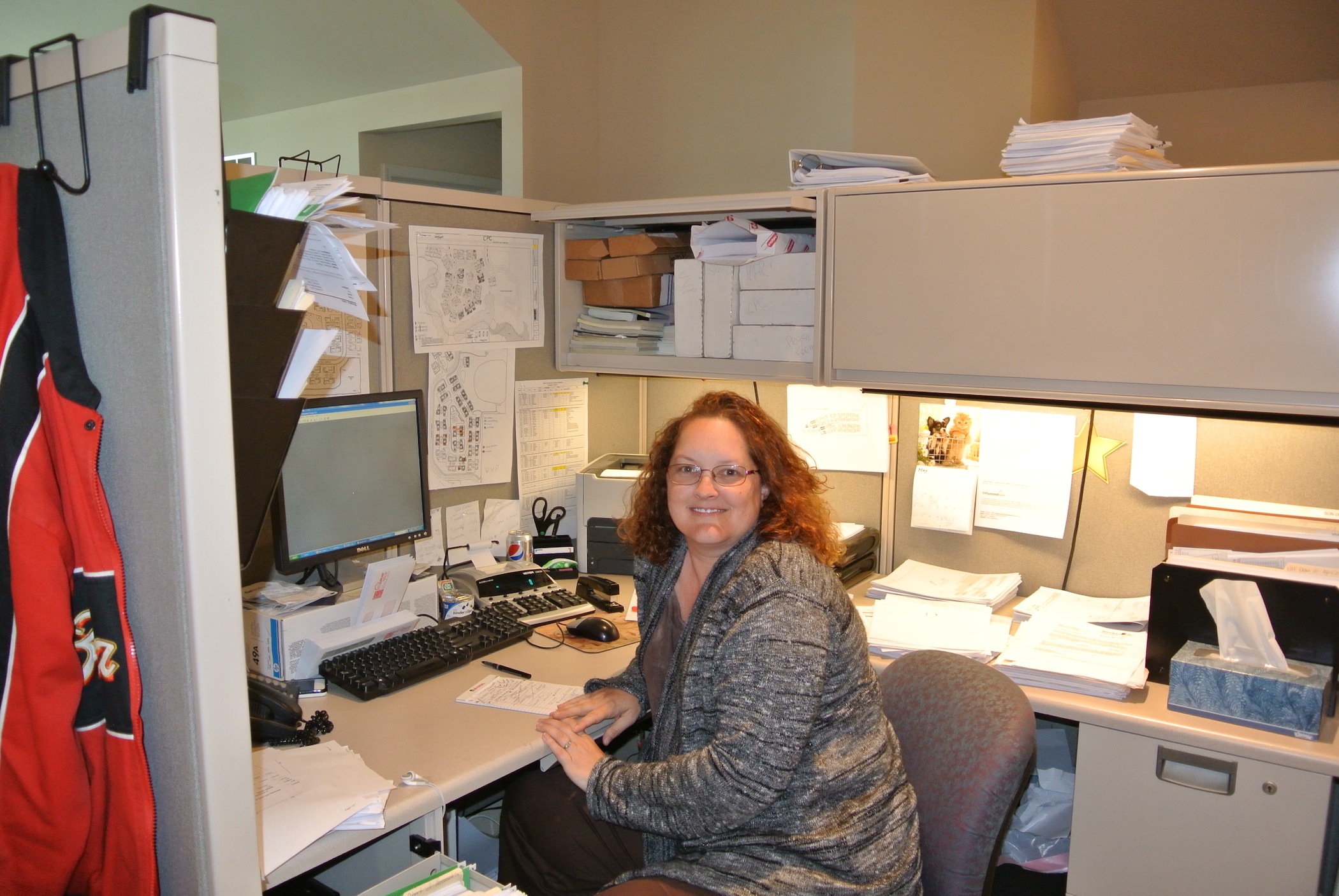 The living room is partitioned into a number of office spaces, many of them quite cozy. Here, for example, is Julie Murphy, an accounting assistant, at work at her desk.