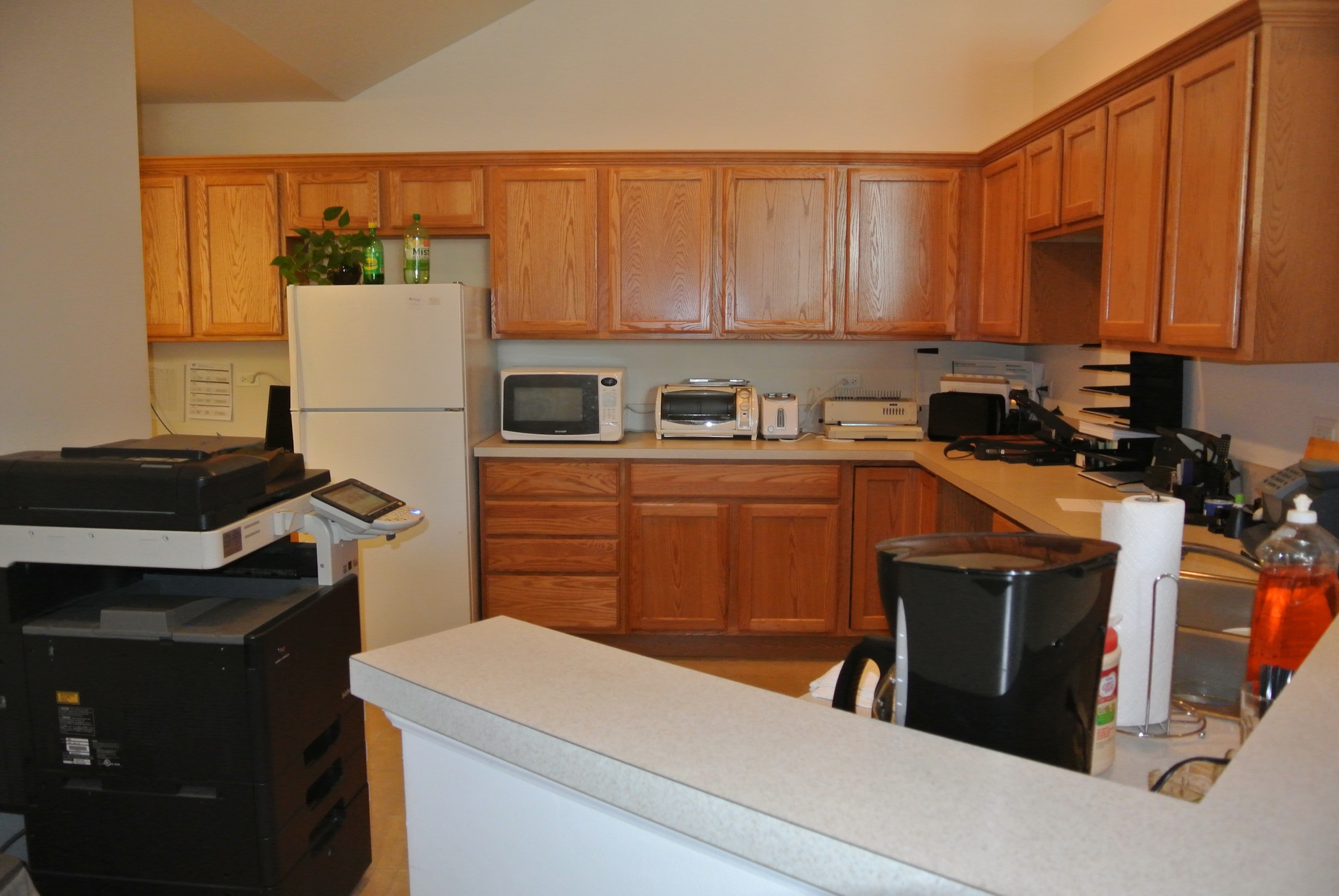There are two shared spaces in the office. One, the sunroom, makes a good conference room. The other is the kitchen, which is a multi-purpose combination of kitchen, break room, and office workroom.