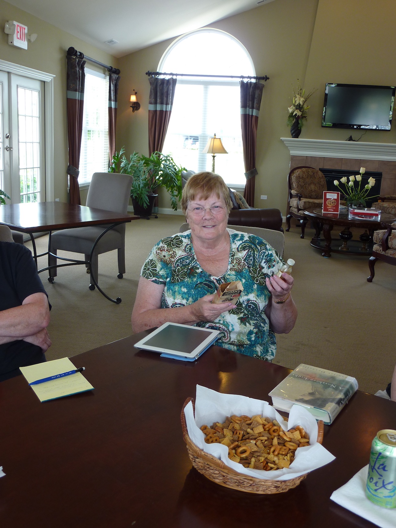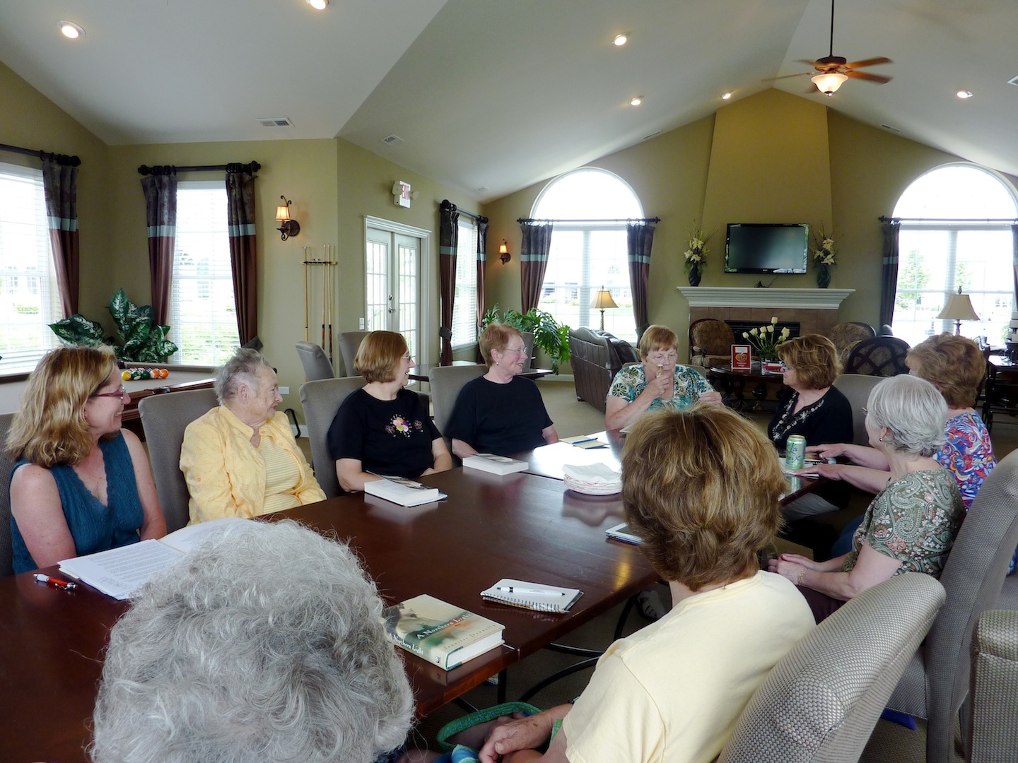 Before we return to the meeting, here is a little background. The Maples book club was organized as a project of our social committee. We first met in April 2011, when five of us — all of whom still are in the club — gathered to discuss The Art of Racing in the Rain. By the next month, our attendance had doubled; we have now grown to 15 members, with more expected. Besides its appeal to readers, the club has proven a good way for new neighbors to get acquainted with older residents.