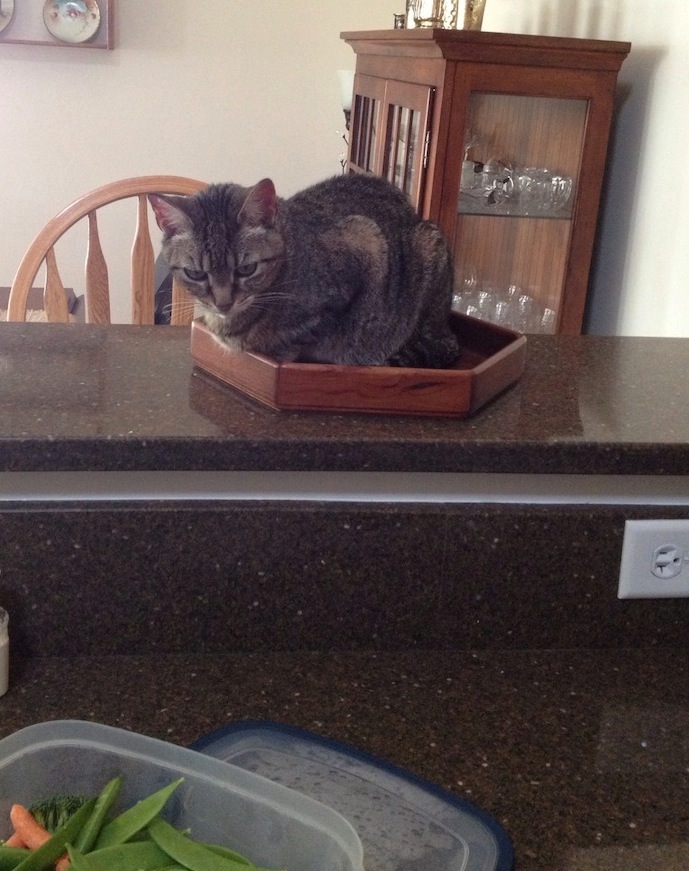 It’s barely high enough, though, so most of the time I use my other place. It is a handcrafted wooden tray that Caryl bought at a church bazaar. She says don’t tell the man who made it that I am using it. I don’t know why. He should be honored.