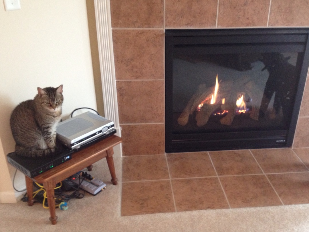 In the winter, I like to hang out on the cable box by the fireplace. It’s really warm there.