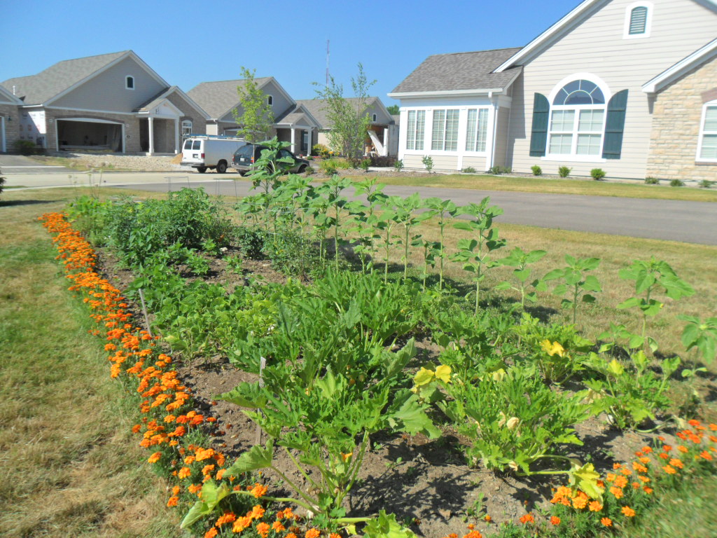 This year is by far the best yet. Our crops include green peppers, tomatoes, zucchini, summer squash, green beans, lettuce, collards, and a number of different herbs. The garden is completely enclosed by a row of flowers, with sunflowers along the back and marigolds on the front and sides. Those marigolds were a gift from Wilcox Communities, received during our Flower Power event in May.