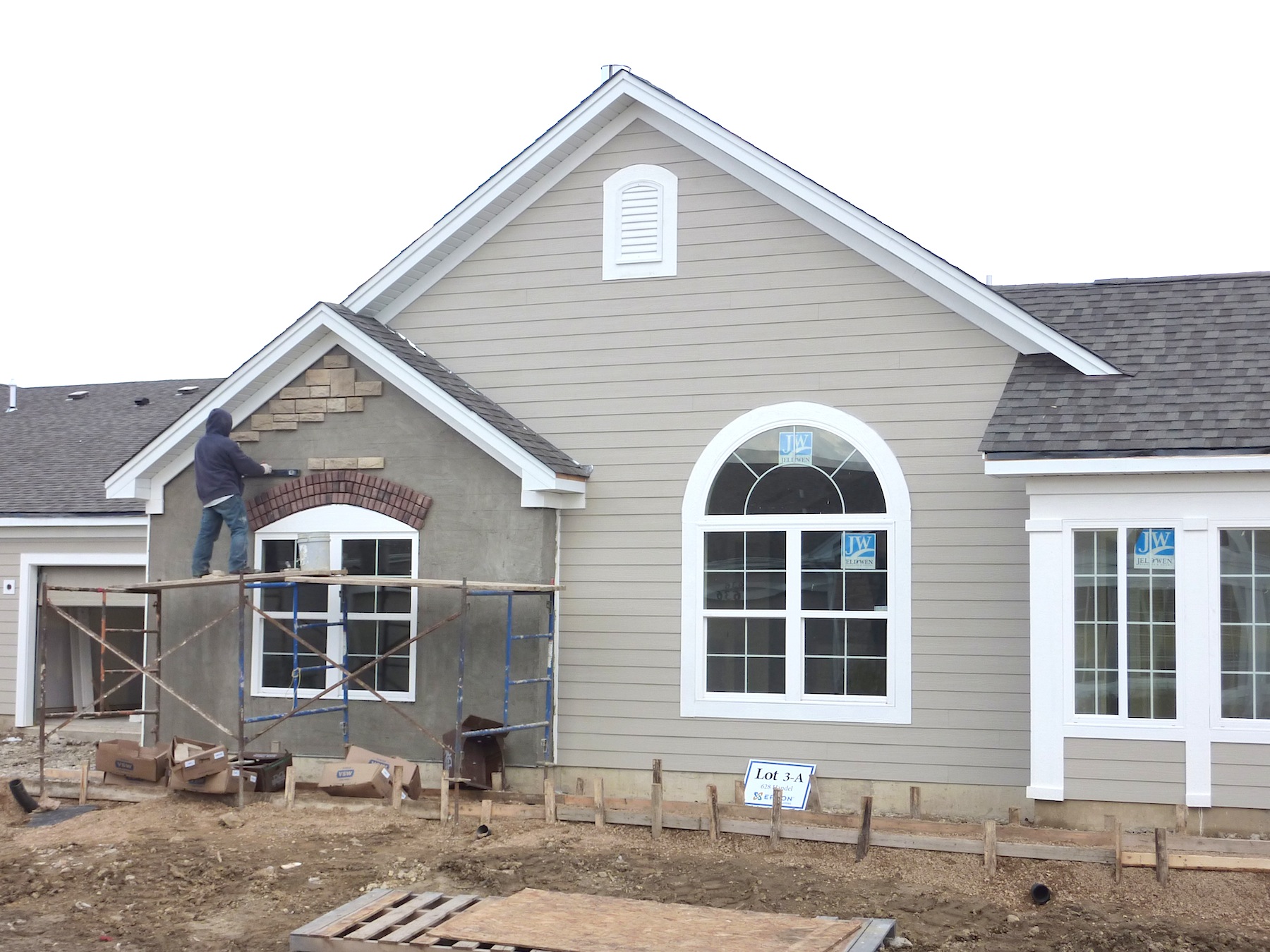 And here, garage doors are installed, and a lot of trim work has been done. The siding covering the Tyvek homewrap is making it look more like a real home.