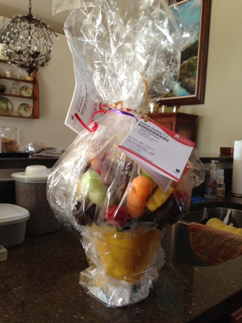 Let me just give some examples. Neighbors have done my laundry and changed the sheets on my bed. They have found me a counter-top microwave that I can easily reach from a wheelchair. They have cleaned up cat vomit. They have shoveled my walk and gone to the store. They have taken down my outdoor Christmas lights. They have brought me flowers. One neighbor, Sharon, who is wintering in Florida, sent me an Edible Arrangement. Here it is before I ripped it open.