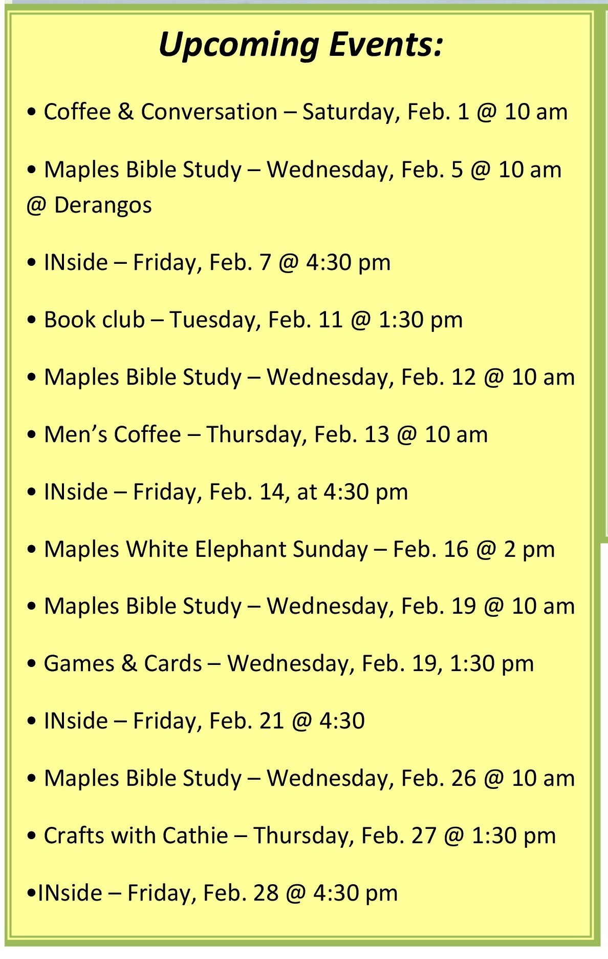 The Maples Bible Study group will hold its first meeting Feb. 5 and will meet weekly throughout the month to study Paul’s letter to the Romans. Those organizing the group are Barb, Judi, and Gloria and Ken.