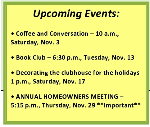 I have no doubt that our list of activities will continue to expand. Each homeowner who joins our neighborhood brings a new set of interests, experiences, and talents. Each helps us to grow as individuals and a community.