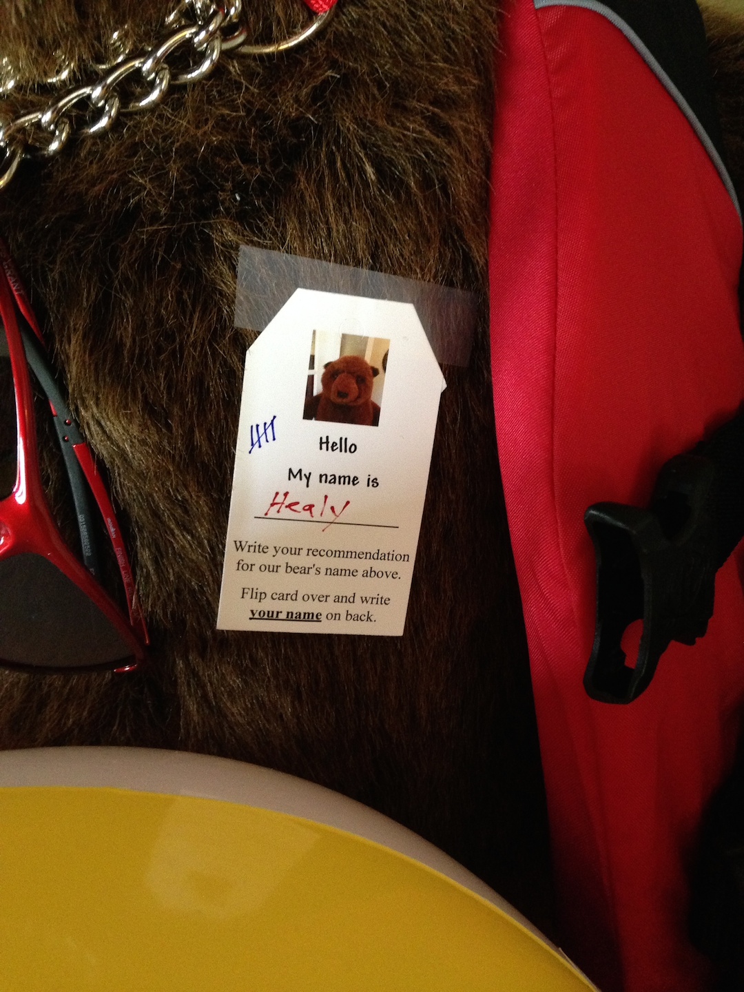 The winning name, suggested by Roy, was Healy, the last name of the couple who donated the bear to our clubhouse when they moved in.