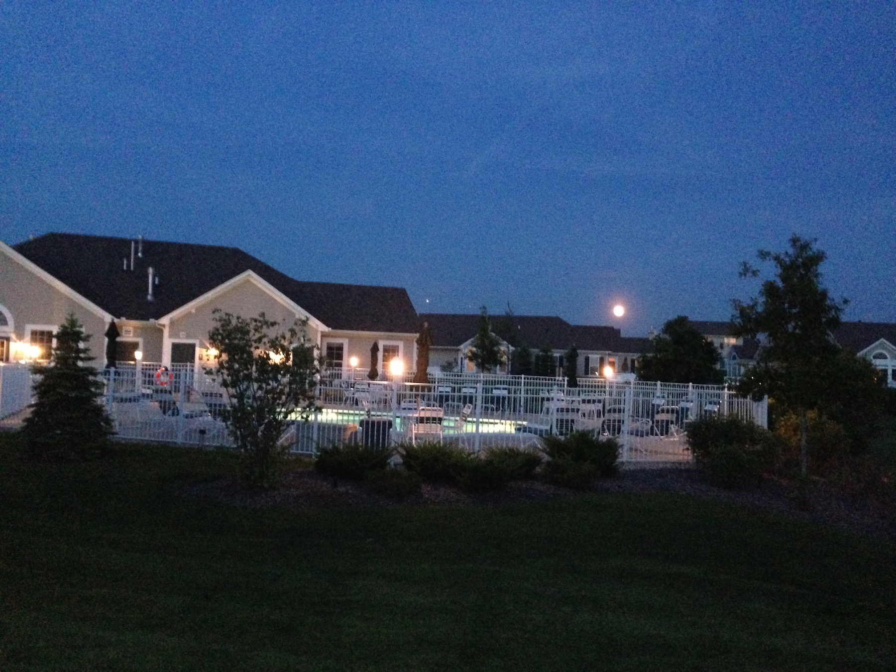I begin in the most illuminated spot. Our beautiful pool area glows in the night, at least until midnight when its lights go off.