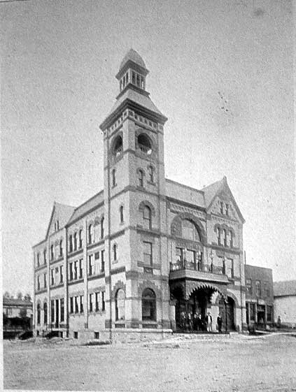 In 1887 the county built a jail next to the courthouse. Two years later, work began on the Square’s opera house. This imposing Romanesque-styled building originally held, in addition to the 64-seat theater, the city hall, the fire department, and the public library.